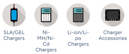 We have a range of battery chargers, for use with lead acid, SLA, AGM, and Lithium batteries used in cars and other equipment. We also have phone chargers and solar chargers.