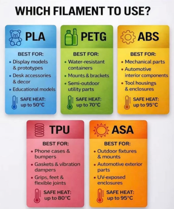 Each filament type has its unique properties, making them suitable for different applications. If you have a specific project in mind, we can help you choose the best filament for it!