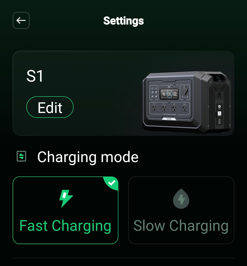 In the App: Disconnect any power input. Go to Settings, choose the charging mode.